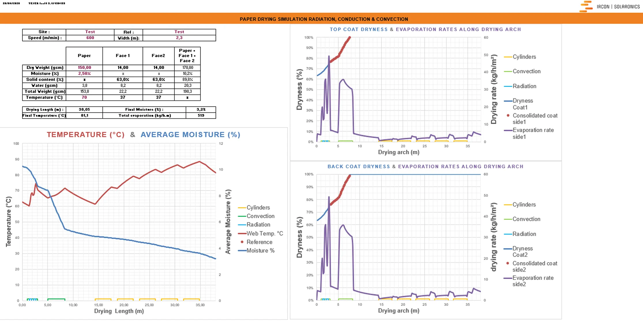 The program simulates the end-results as well the status at any point between the application of the coating and the end of the drying section. Detailed results are plotted, covering local evaporation rates, solid content, moisture and web temperatures. The results can be tuned to take into account parameters deviating from normal behaviour linked to specific process conditions, age of drying equipment and other influencing factors. This way, the existing process can be mapped close to perfectly.
